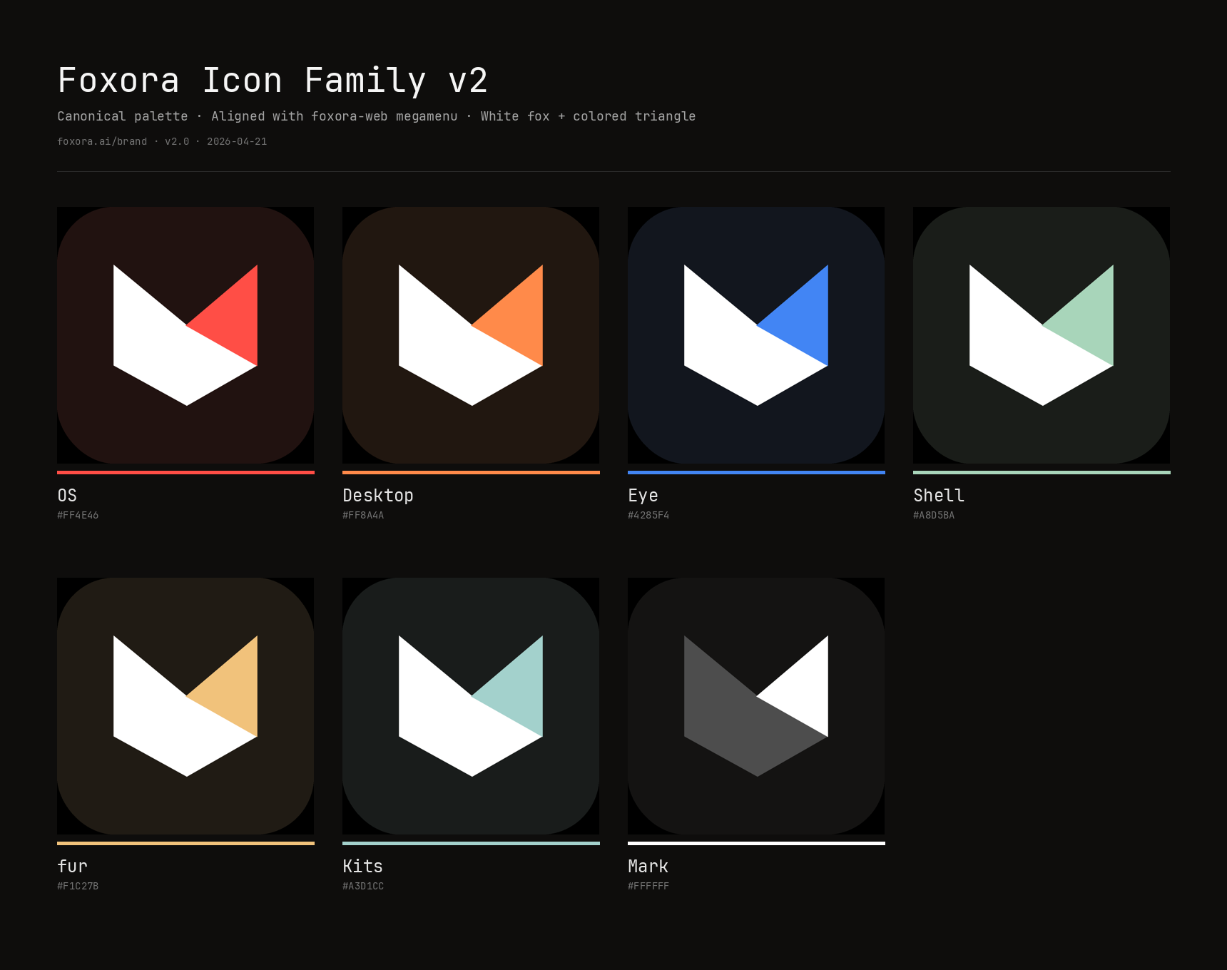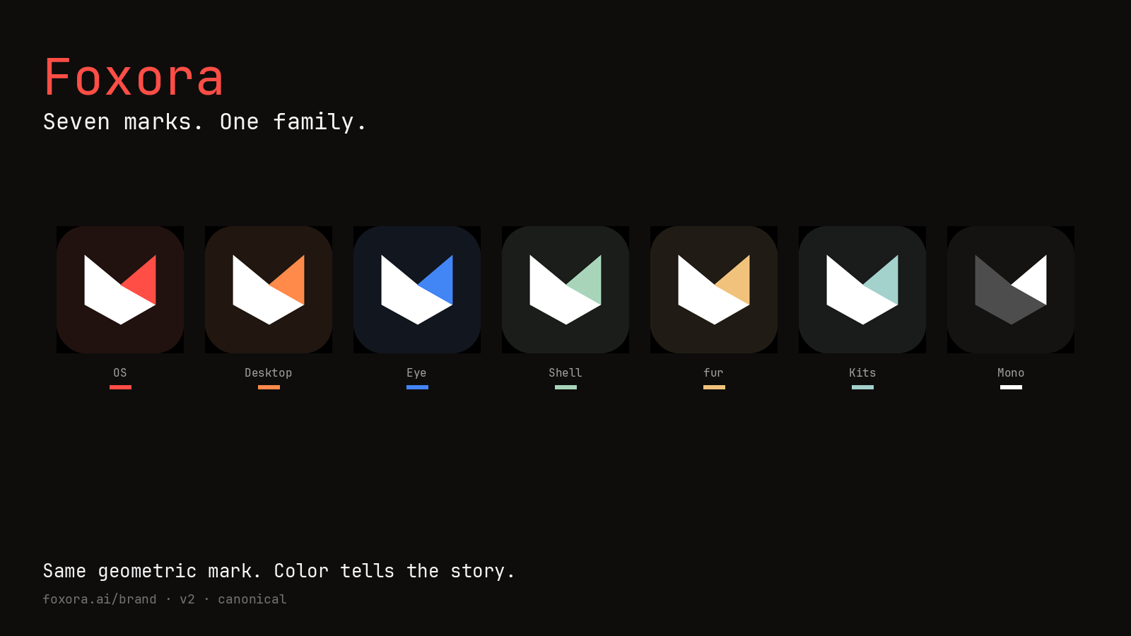 One canonical source. Seven product accents. A white fox, a tinted triangle, and a monospace font built for agents. Everything you need to render Foxora correctly — in pixels or pantone.