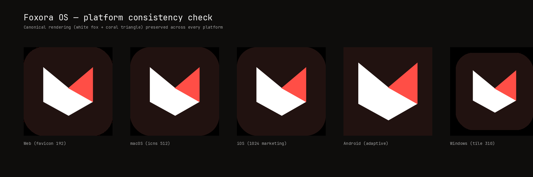 The Foxora mark is exactly two shapes. The outer polygon is always pure white. The inward-facing triangle is the only path that takes the product accent. Two shapes. Six products. One mark.